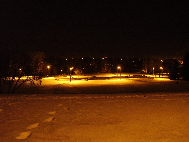 hours, and thus reduce GHG emissions. This is perfect lighting that has low operating cost and cost nothing to implement because responsible lighting was planned from the outset. The orange glow on the snow throughout the rest of the areas comes from poorly shielded cobrahead streetlights nearby.